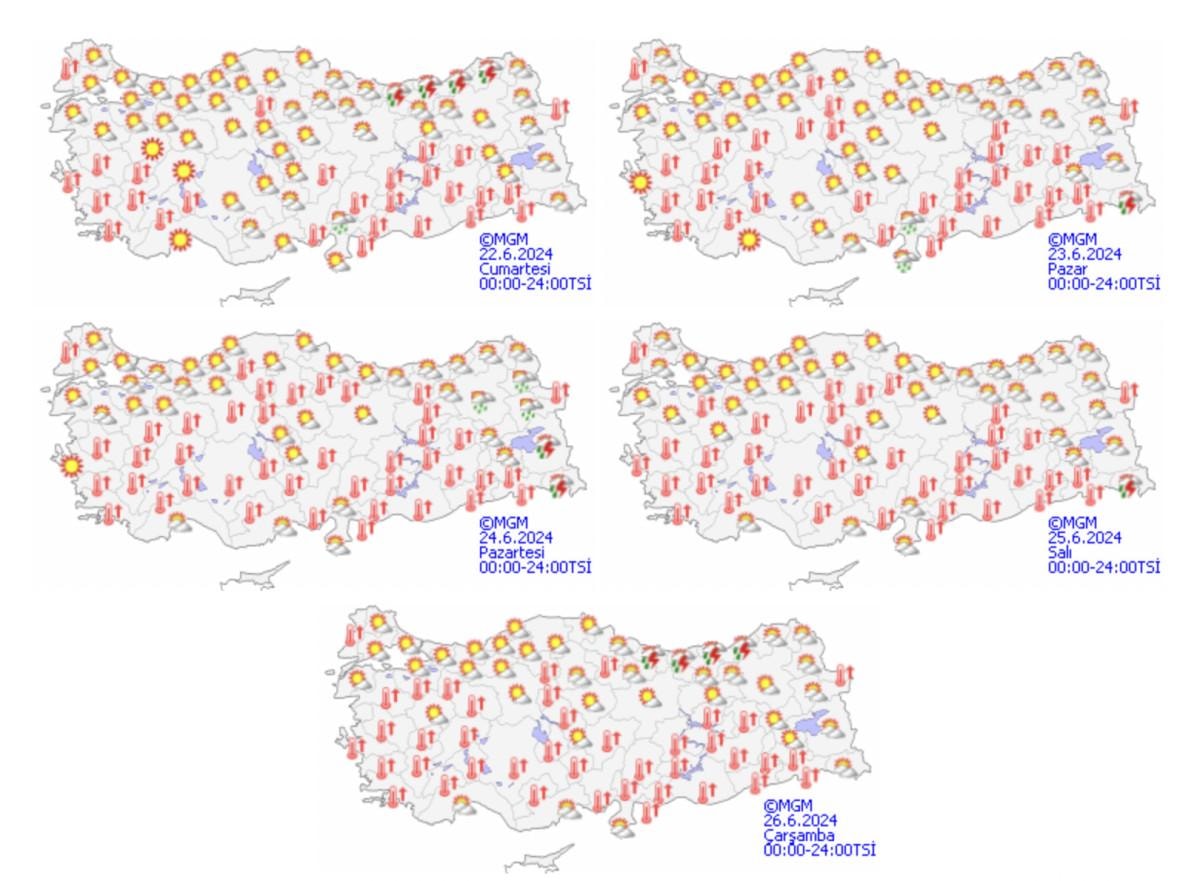 Az bulutlu ve açık, iç kesimleri yer yer parçalı bulutlu, öğle saatlerinde batısının iç kesimleri yerel olmak üzere sağanak ve gök gürültülü sağanak yağışlı