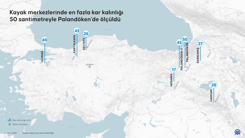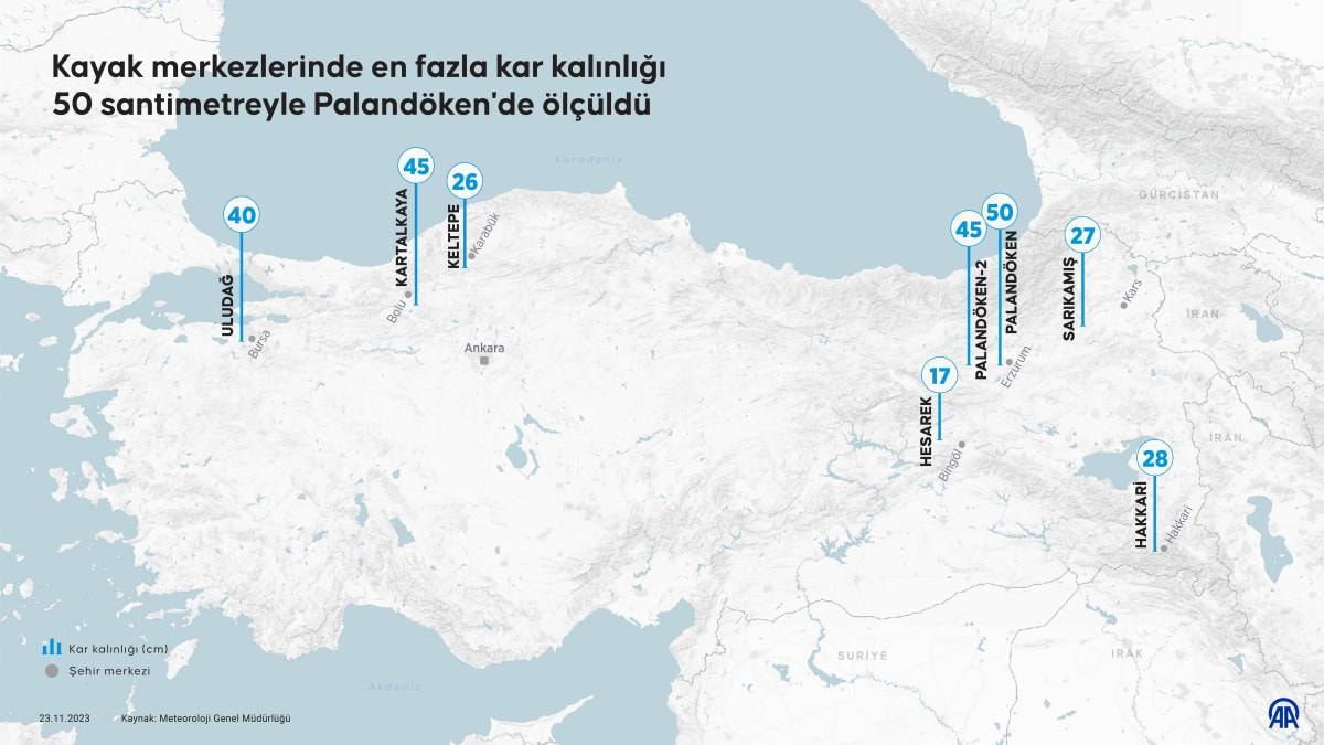 Türkiye'nin önemli kış turizm merkezlerinde kar kalınlıkları ölçüldü. Merkezlerin arasında en fazla kar kalınlığı 50 santimetreyle Palandöken'de kaydedildi.