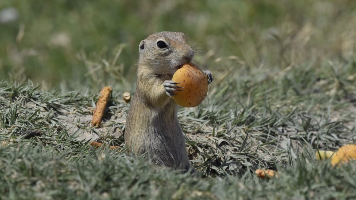 Sevimli sincap, kameralara, Pülümür Vadisi'nde doğaya bırakılan kayısıyı yerken yakalandı.
