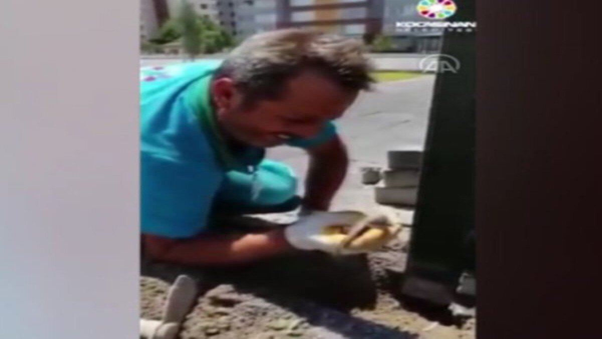 Kara'nın park görevlilerine haber vermesinin ardından olay yerine gelen görevli Mesut Menekşe, kamelya demirine bağlı taşları kazma yardımıyla kırarak kuşu bulunduğu yerden çıkardı.