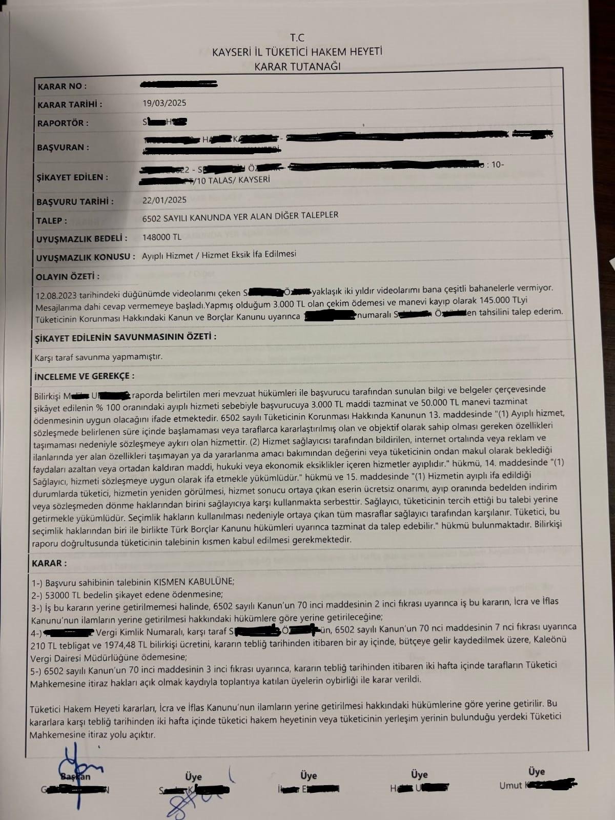 Tüketici devamında hakem heyetine başvuruyor ve manevi tazminat talep ediyor. Hakem heyeti de ödenen ücretin iadesi ve 50 bin TL manevi tazminata hükmediyor. Tüketiciler hakem heyetinden maddi veya manevi tazminat talep edebilirler.