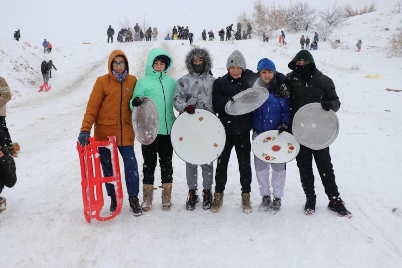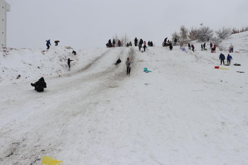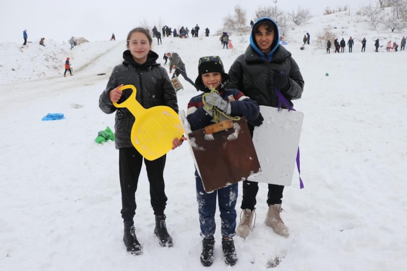 Onlara zaman zaman yetişkinler de eşlik etti. Kayak sırasında onlarca kişi kendisini yokuş aşağı bırakarak karın keyfini yaşadı.