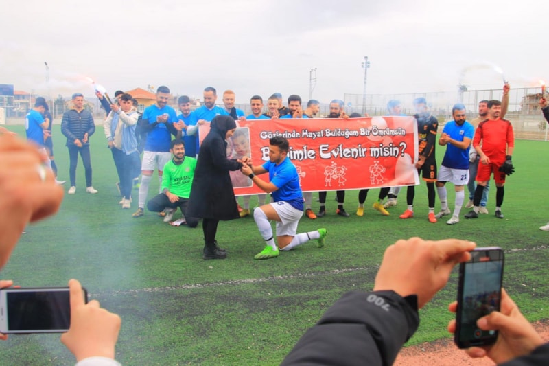 Maç öncesi sözlüsünü tribünden yeşil sahaya davet eden başarılı oyuncusu Tugay Taşoluk, “Gözlerinde hayat bulduğum bir ömrümsün Benimle evlenir misin” pankartı eşliğinde önünde diz çökerek, evlenme teklif etti.