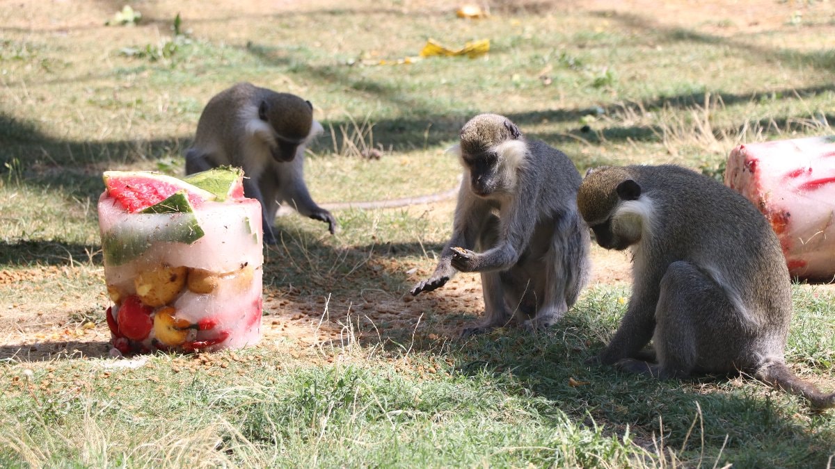 Karpuz, armut, çilek, elma ve kayısı yıkandıktan sonra küçük dilimler halinde kaplara konuluyor, su da eklenerek buzlukta dondurulan meyveler maymunlara veriliyor.