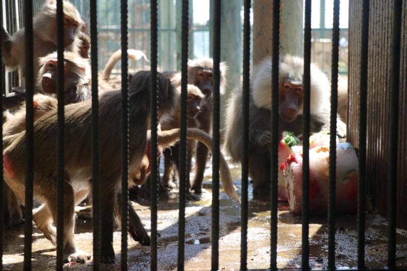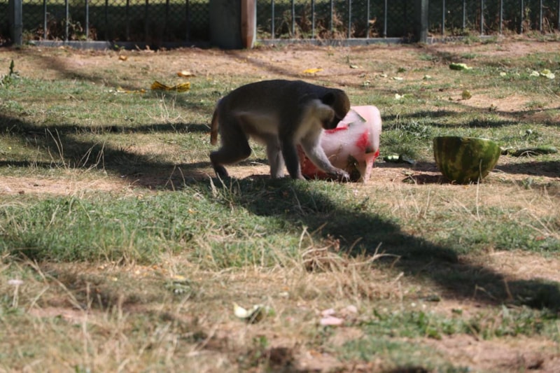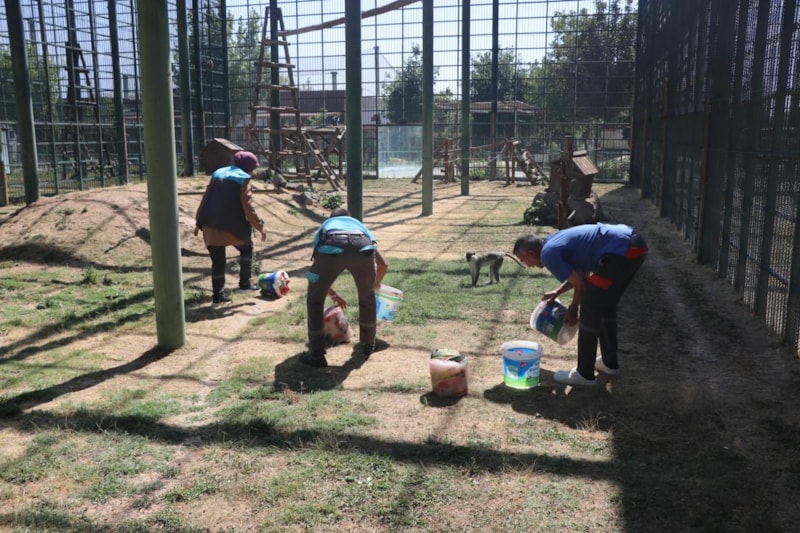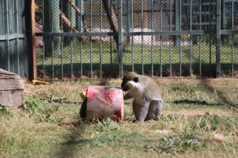 Bu şekilde hayvanların serinlemesine yardımcı oluyoruz. Barınaklarda iklimlendirme çalışması yapıyoruz. Buzlu kokteylimizin içinde mevsim meyveleri; kavun, karpuz, üzüm var. Maymunlar bu şekilde serinlemiş oluyor. Beslenmelerinde serinlemelerine katkı sağlıyoruz. İştahlı şekilde bunları tüketiyorlar. Biz de onlar serinledikçe mutlu oluyoruz. Onlar da bu durumdan gayet memnunlar.” diye konuştu.