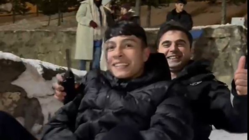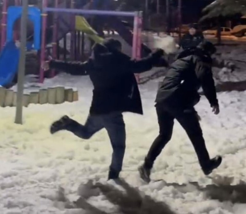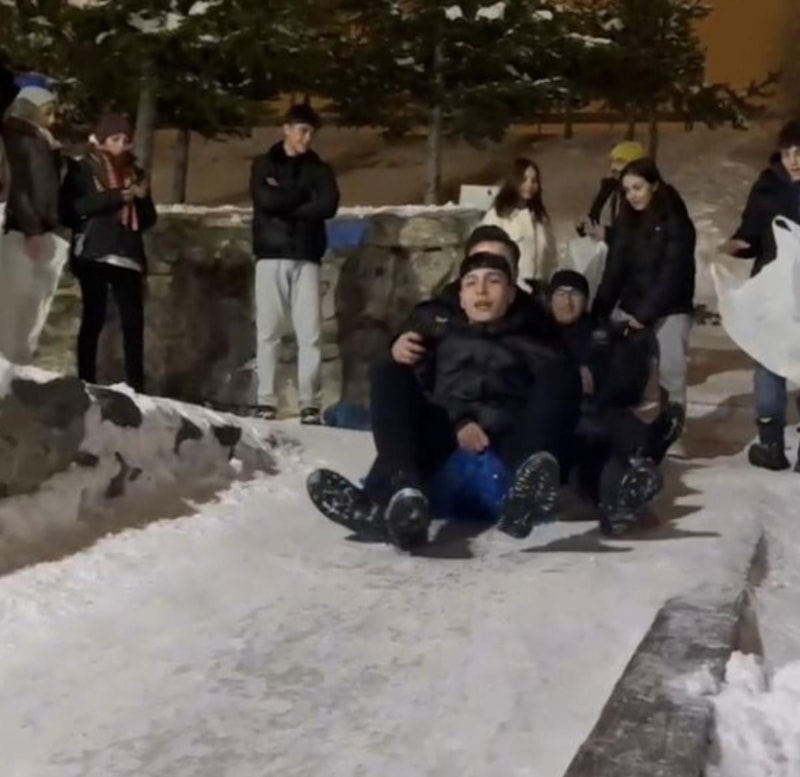 Kentte devriye görevi yapan polis ekipleri, bir parkta çocukların kar topu oyununa eşlik etti ve birlikte poşetlerle kaydı.
