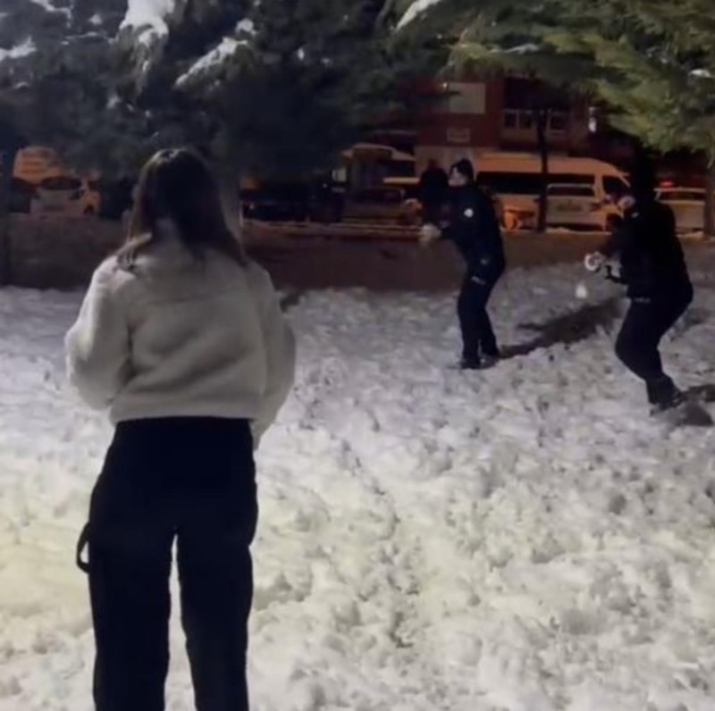 İlçede devriye görevi yapan polis ekipleri, Necmettin Erbakan Parkı'nda çocukların isteği üzerine birlikte kar topu oynadı.