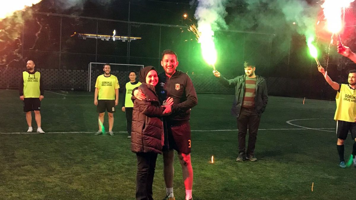 İHA'nın haberine göre, futbolcunun planı düzenlediği arkadaşları ise saha içinde meşale yakarak çifte eşlik etti.