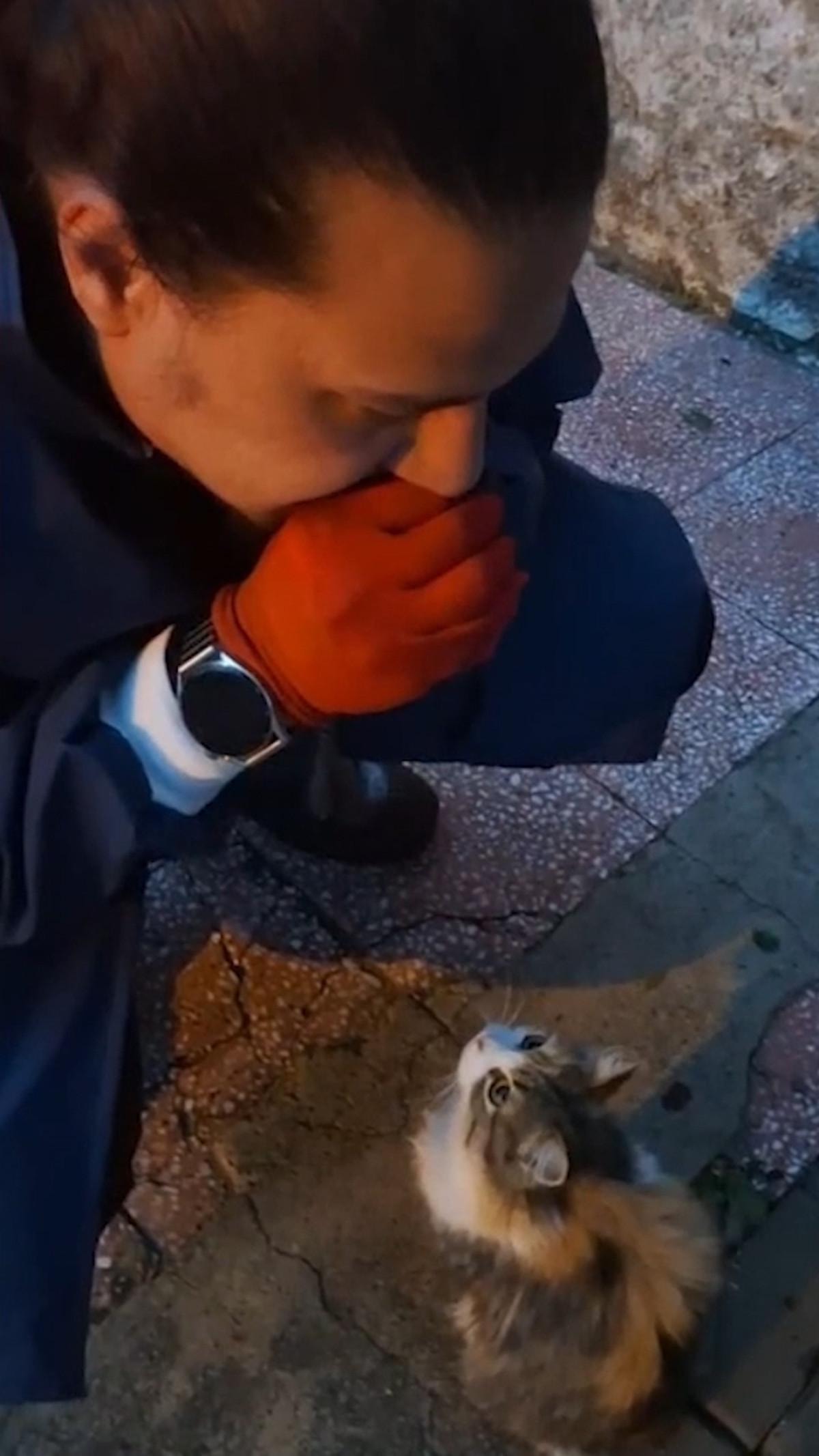 İtfaiye eri Aygün'ün kediye müdahale ettiği anlar, cep telefonu kamerasıyla kaydedildi.