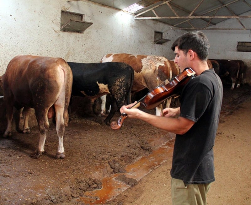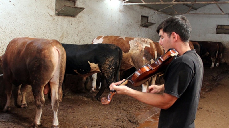 Sabah ve akşam olmak üzere iki kez birer saat hayvanlara keman çalıyorum. 5-6 şarkı çalar, söylerim. Aynı zamanda solistlik de yapıyorum, bağlama da çalıyorum.