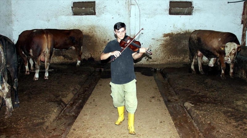 Bahşılı ilçesinde ailesiyle birlikte besicilik yapan 20 yaşındaki Hamit Keleş, büyükbaş hayvanlarına keman çalıp şarkı söyleyerek eşsiz bir müzik ziyafeti sunuyor.