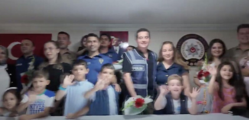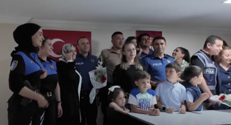 Sürpriz bu kadarla bitmemişti. Görüntülerdeki çocuklar video bitince birden ellerindeki çiçek ve hediyelerle salona doldu. Polis ve bekçiler bu anlarda gözyaşlarını tutamadı.