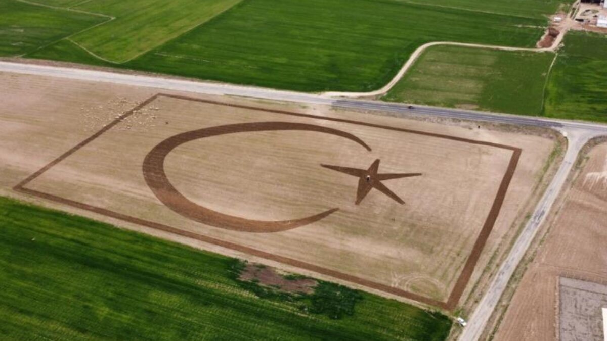 Çağlar Ailesi, merkeze bağlı Ulupınar köyünde 70 bin metrekarelik boş tarlaya 50 bin metrekarelik Türk bayrağı çizdi.