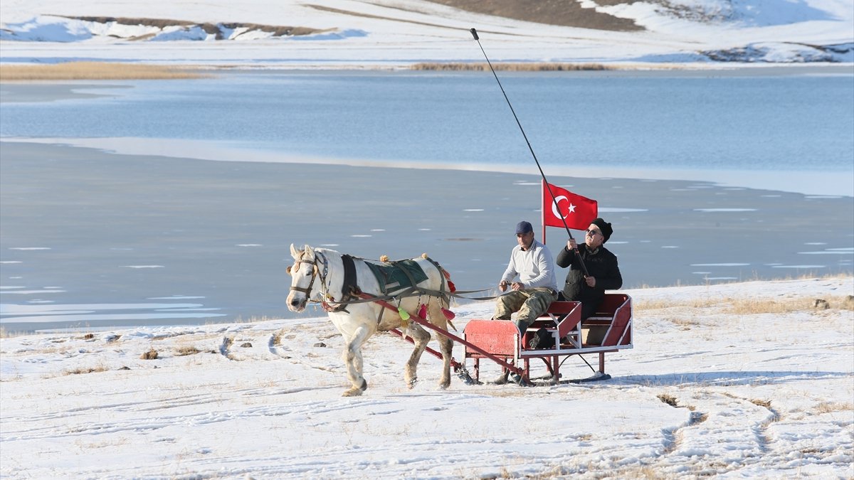 Kars'ın Arpaçay ilçesine bağlı Taşbaşı köyü mevkisinde buz tabakaları görülen göl, ziyaretçilerini de ağırlamaya başladı. Atlı kızakçılar, etrafı beyaza bürünen göl kıyısında vatandaşlara hizmet veriyor.