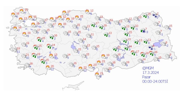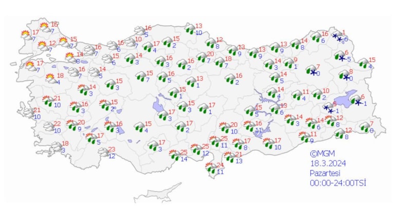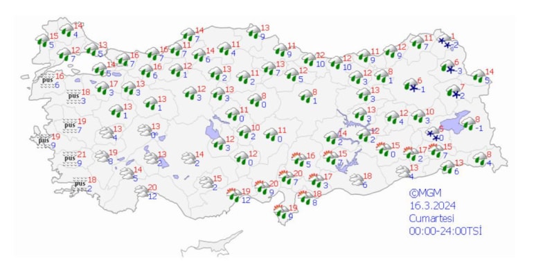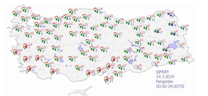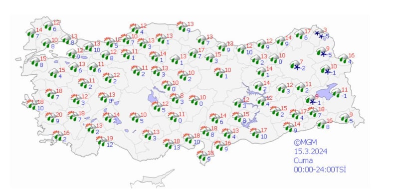 Yurt genelinin parçalı ve çok bulutlu, Marmara, Ege, İç Anadolu, Karadeniz, Van dışında Doğu Anadolu bölge geneli, Güneydoğu Anadolu'nun kuzeyi ile Gaziantep ve Kilis çevrelerinin aralıklı yağmur ve sağanak, yer yer gök gürültülü sağanak, Doğu Karadeniz'in iç kesimleri ile Doğu Anadolu'nun kuzeydoğusunun yükseklerinin karla karışık yağmurlu geçeceği tahmin ediliyor.