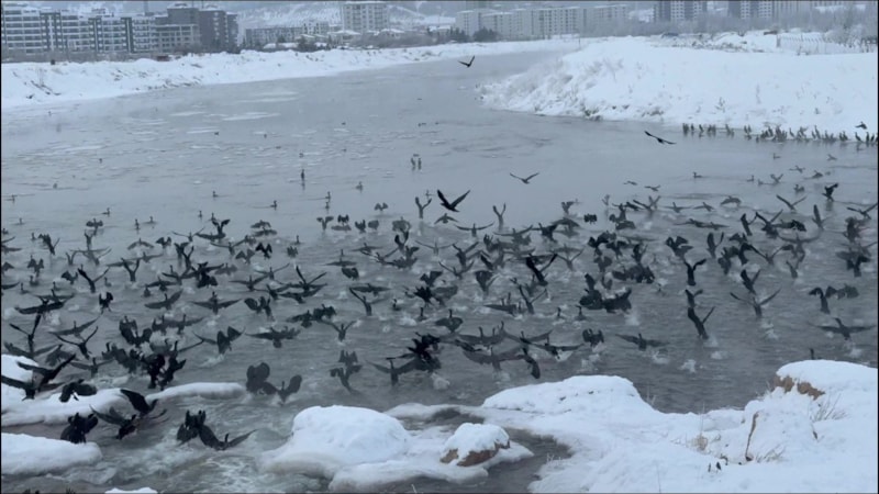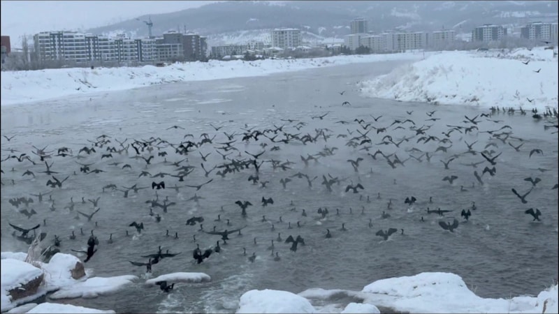 Sivas’ta etkisini artıran dondurucu soğuklara rağmen binlerce karabatak, Kızılırmak Nehri’ni mesken tuttu.