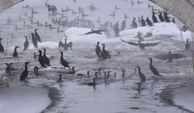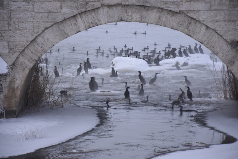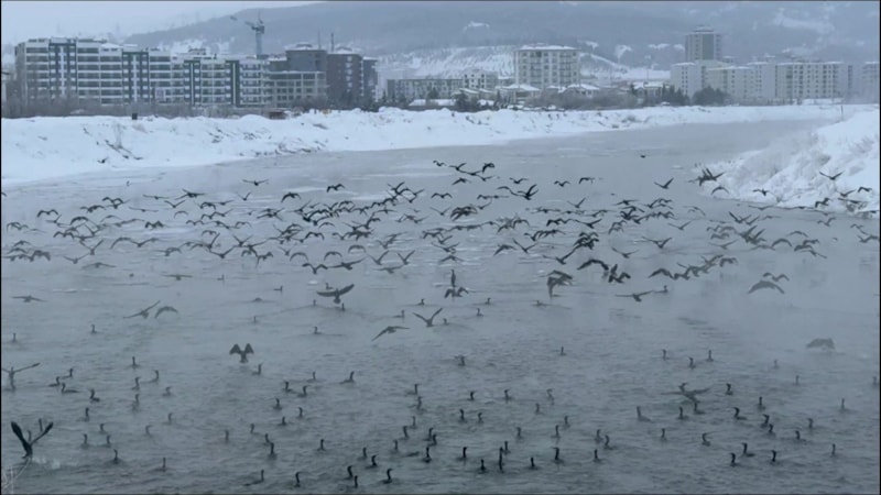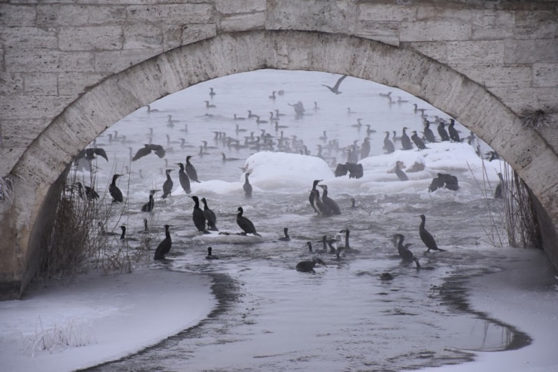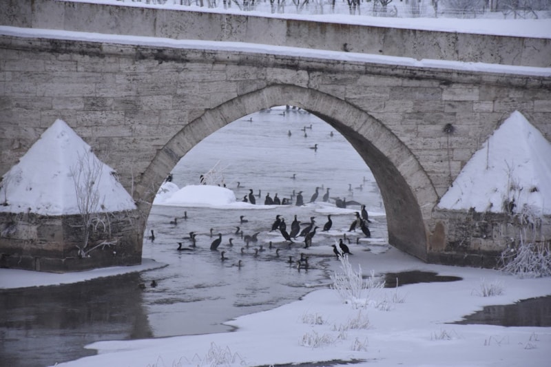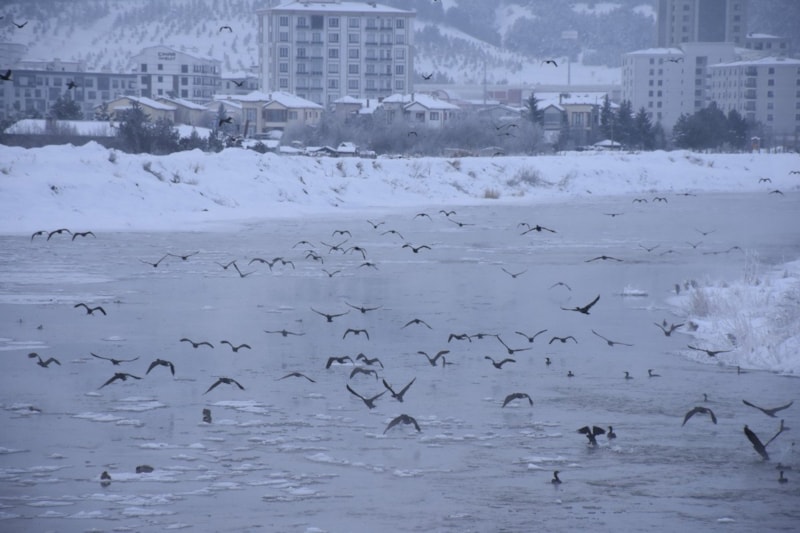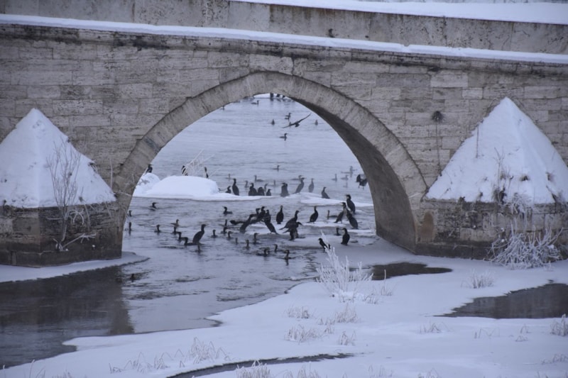 Son yılların en sert kışlarından birinin yaşandığı Sivas’ta, kar yağışı ve eksi 20 dereceyi bulan soğuklara rağmen Kızılırmak Nehri sürpriz misafirlere ev sahipliği yapıyor. Binlerce karabatak, nehrin kent merkezinden geçen tarihi Eğri Köprü çevresinde yoğunluk oluşturdu.