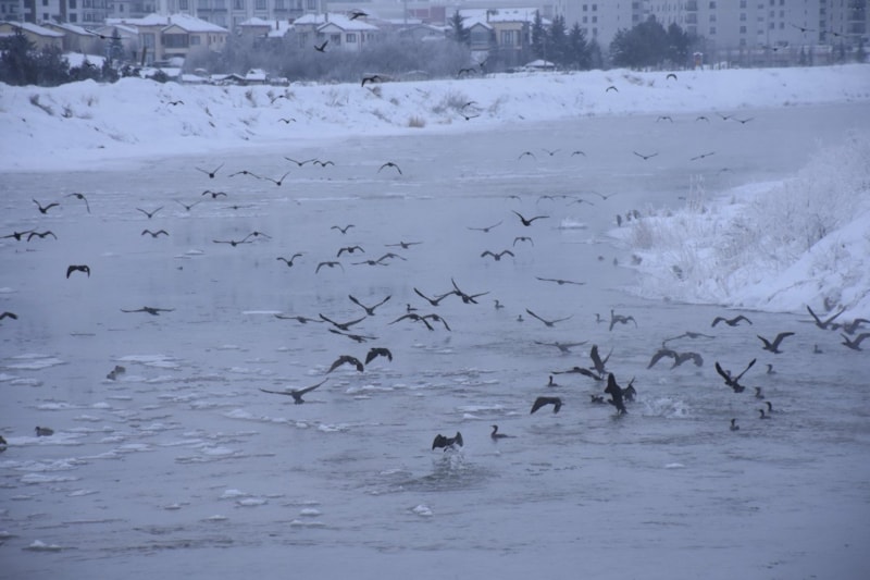 Hava sıcaklığının sıfırın altına düştüğü günlerde Kızılırmak’ta konaklayan karabataklar, soğuğa aldırış etmeden suya dalarak balık avladı. Daha önce de benzer şekilde nehirde görülen kuşların, donma noktasına yaklaşan suda rahatlıkla yüzmesi ve beslenmesi dikkat çekti. Karabatakların su üzerindeki hareketliliği ve toplu halde havalanışları objektiflere yansıdı.