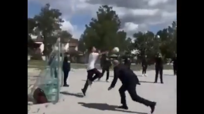 KKTC Cumhurbaşkanı Ersin Tatar, bir okulun bahçesinde öğrencilerle futbol maçı oynadı. Maçın oynandığı esnada topa kafa atmak isteyen Tatar, kendisini yerde buldu.
