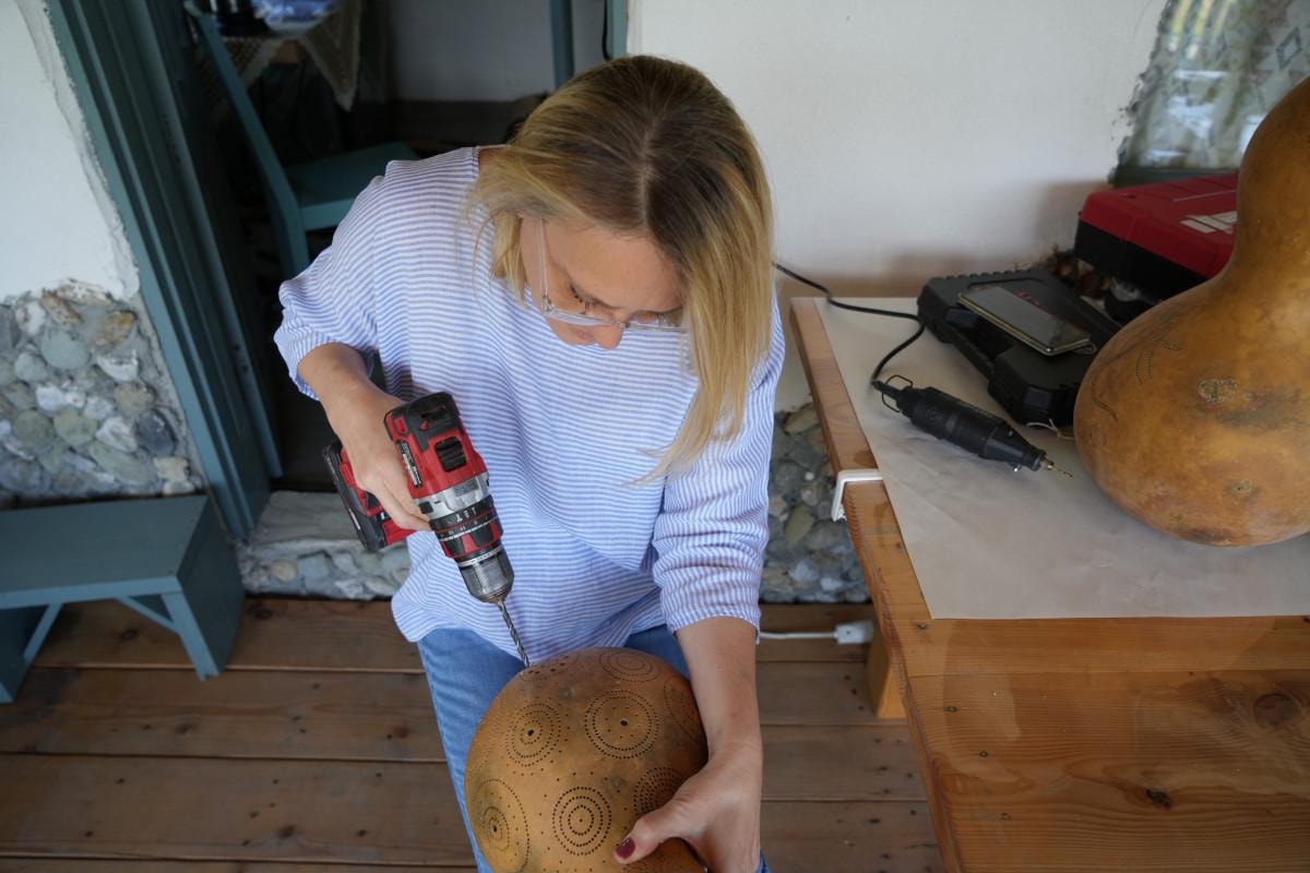 Kabak tasarımı hakkında bilgi veren Aldemir, "Ham kabağın dışında küf gibi görünen sağlıklı korunması için tabakası var. O tabakayı tel ile yıkıyorum. Sonrasında objenin resmini çiziyorum, bu tamamen hayal gücünüze kalmış. Zaten benim için de en güzel yanı bu. Sonra matkapla deliyorum. Deldikten sonra isteğe göre bazen boyuyorum, bazen ham haliyle bırakıyorum. En sonunda ise boncuğu ve ışığını takıyorum" diye konuştu.