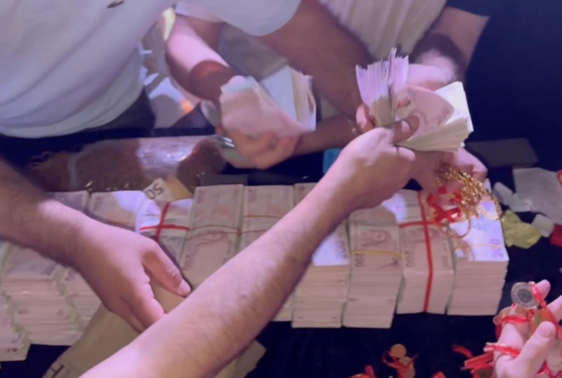 Gelin ve damada 19 milyon 800 bin lira nakit para ve 5 kilo altın takıldı.