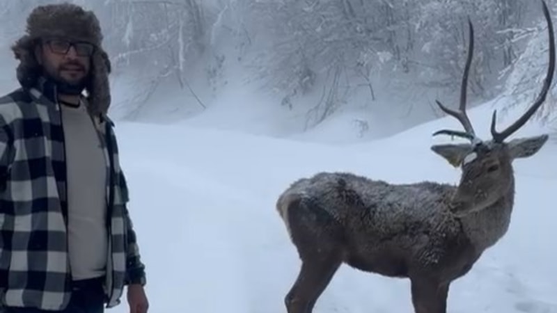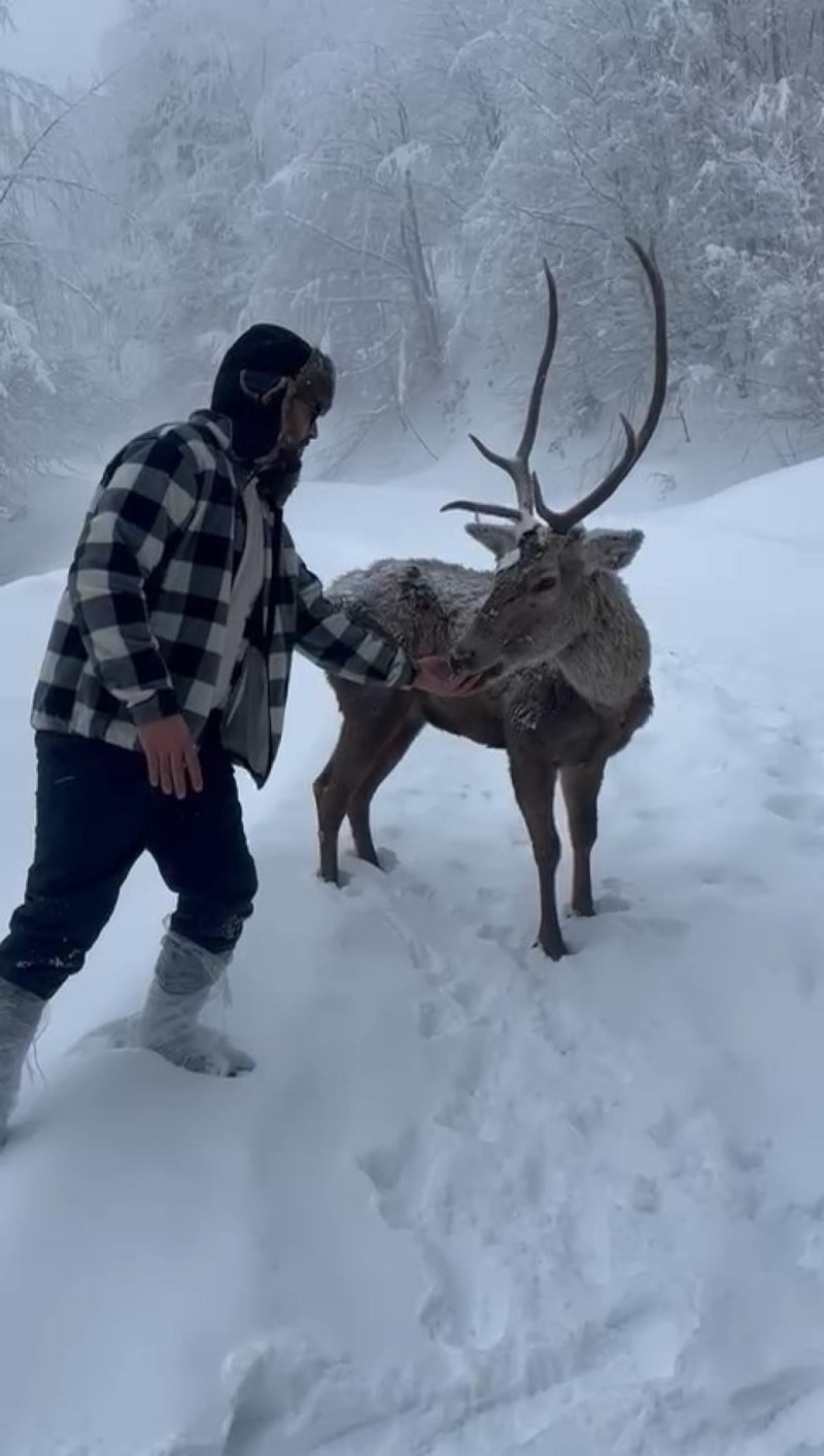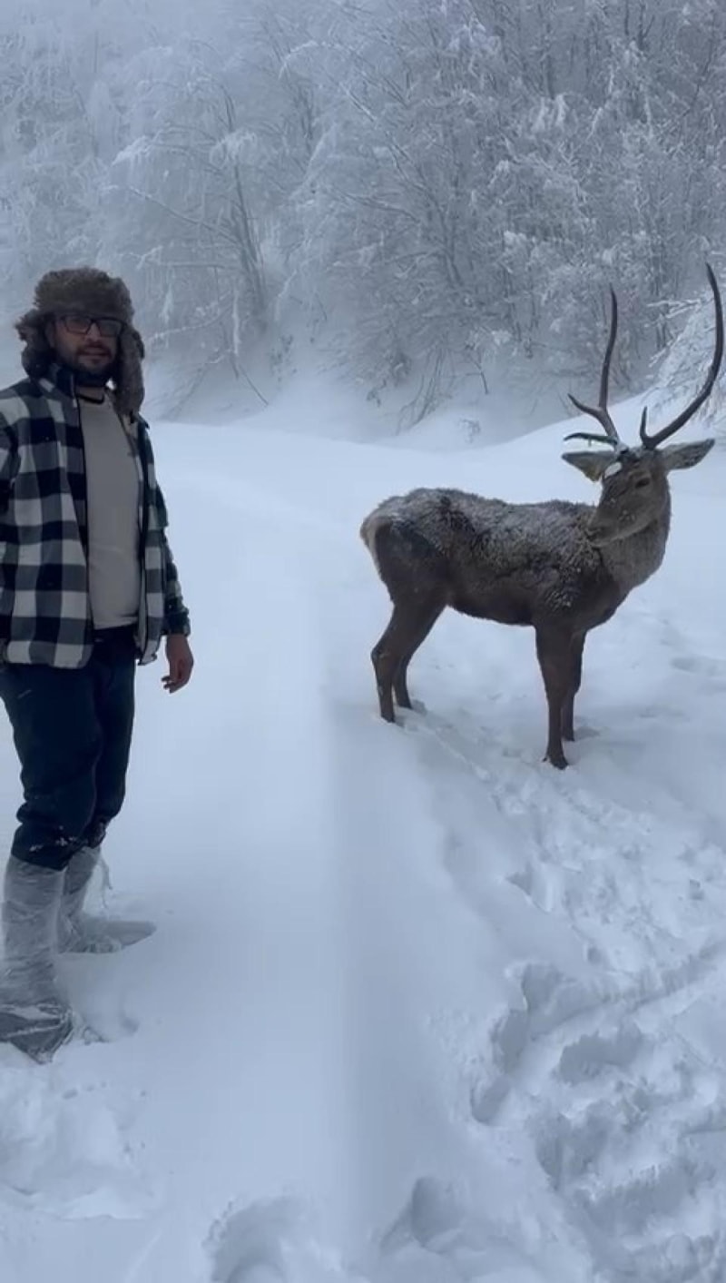 KARŞILARINA ÇIKAN GEYİĞİ ELİYLE BESLEDİ
