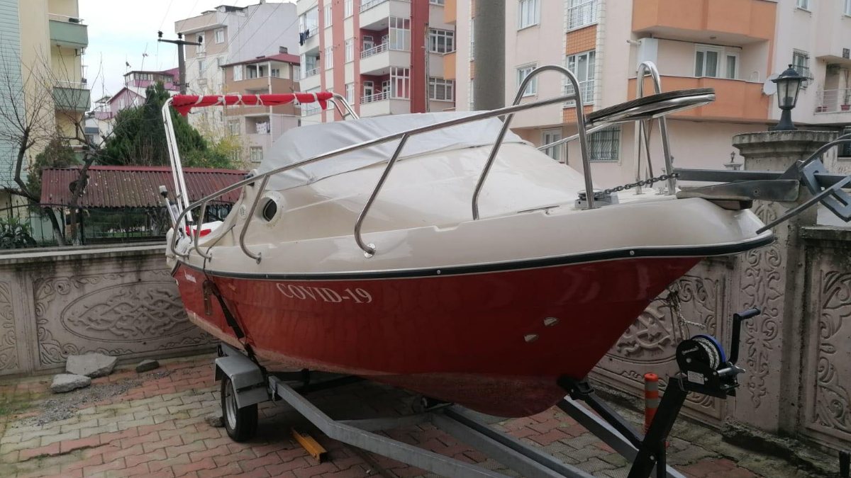 Kocaeli'nin Gebze ilçesi Köşklüçeşme Mahallesi'nde bir evin bahçesinde tekne çeki römorkunun üzerinde bulunan teknenin ismi dikkat çekti.
