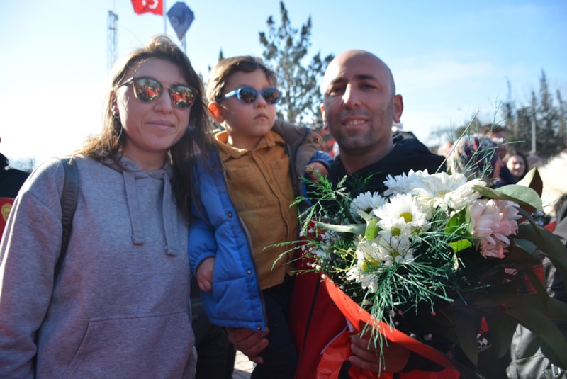 13 günlük canhıraş çalışmalarını tamamlayan ekipler, çiçeklerle karşılandı.