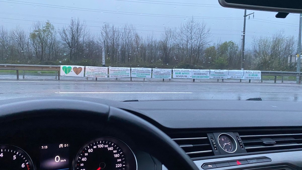 Kim olduğu öğrenilemeyen bir vatandaş, eşine kendisini affettirmek için Maşukiye yolunu pankartlarla donattı.