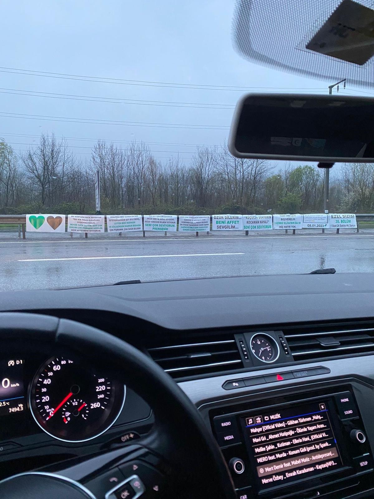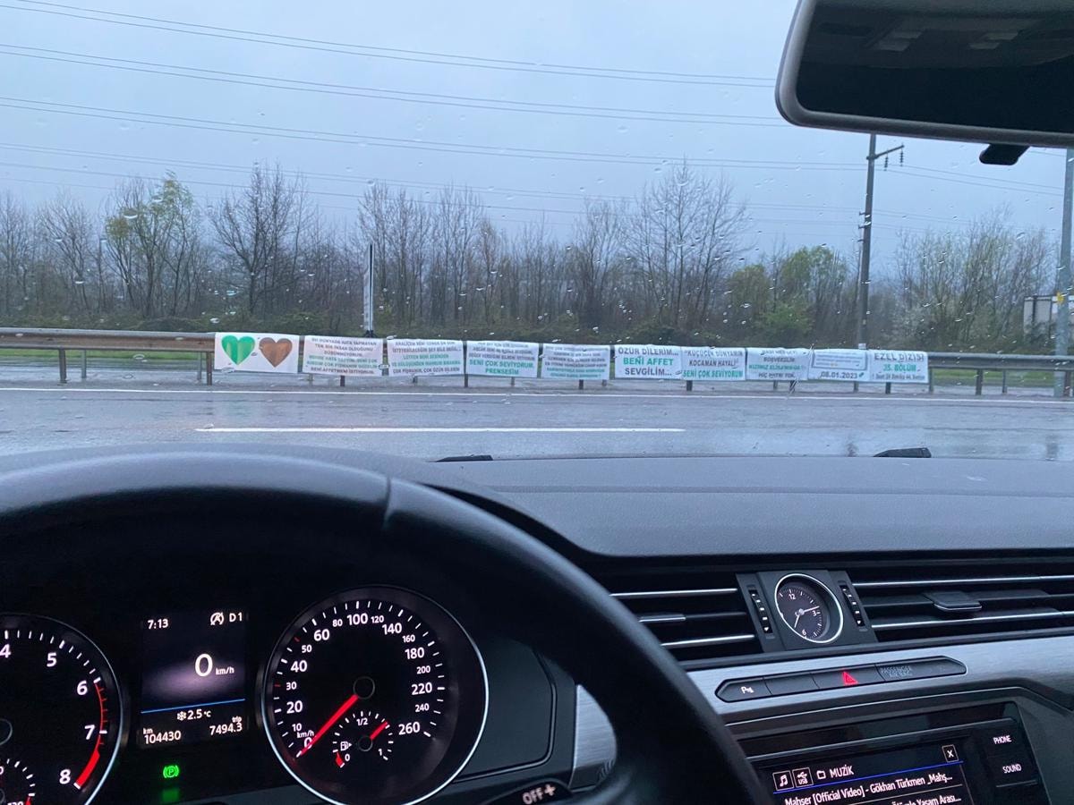 Yol kenarında uzanan pankartların üzerinde “Küçücük dünyamın kocaman hayali, seni çok seviyorum”, “Özür dilerim beni affet sevgilim”, “Hadi her şeyi boş verelim, kızımız Elisa’nın da mı hiç hatrı yok” gibi yazılar olduğu görüldü.