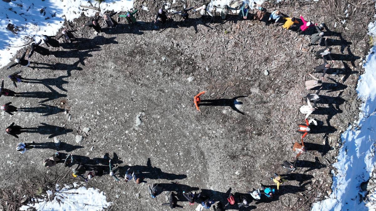 Parkurun sonunda dans edip eğlenen kadınlar, kar üzerinde bedenleriyle gülen yüz çizerek kadına karşı şiddete dikkat çekti.