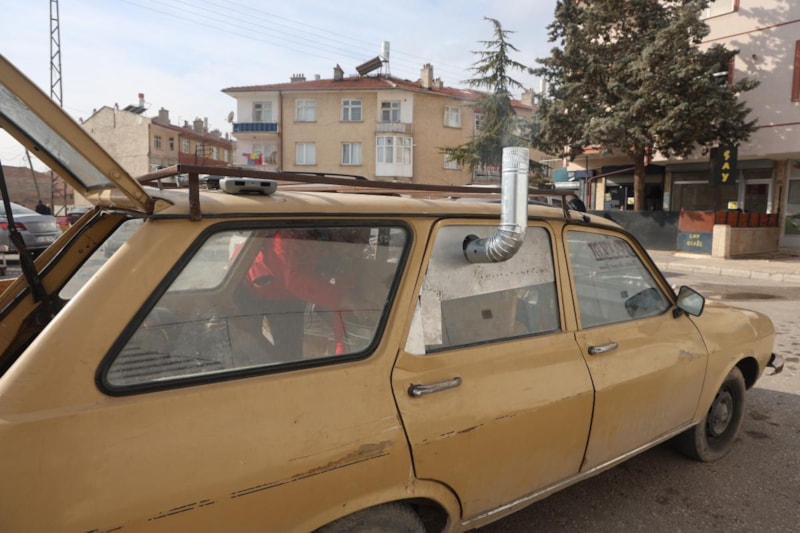 Kasalak, kış aylarında da otomobili ile tavuklarını gezdirmeye devam etmek için araç içerisine mini odun sobası kurdu.