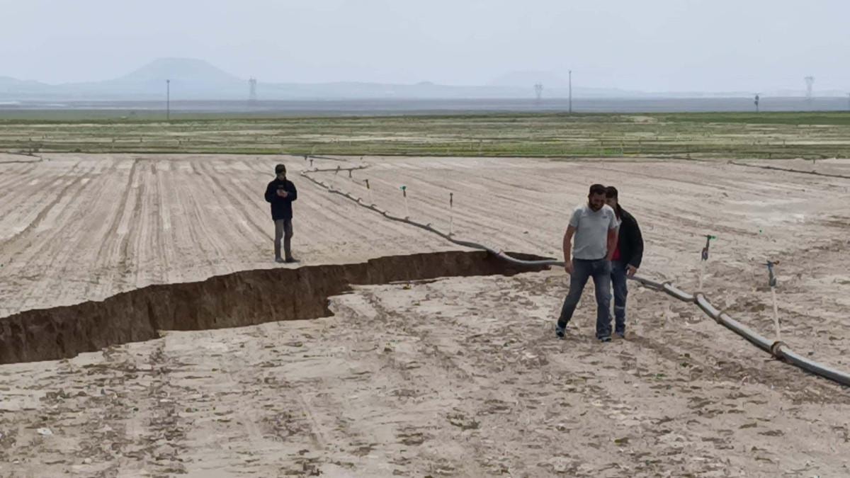 Konya'nın Karapınar ilçesinde yer altı sularının çekilip toprağın göçmesiyle oluşan obrukların yanı sıra yüzey yarıkları bölgede görülmeye başladı.
