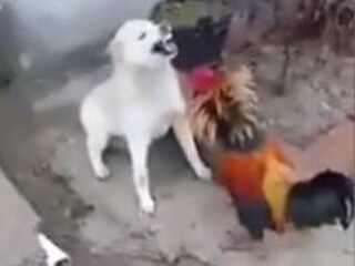 İstese bir hamlede horozu boğabilecek olan köpeğin, çaresizce kendini savunmaya çalışması dikkat çekiyor.
