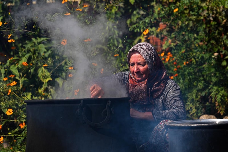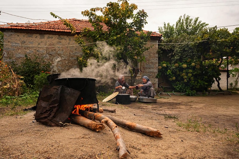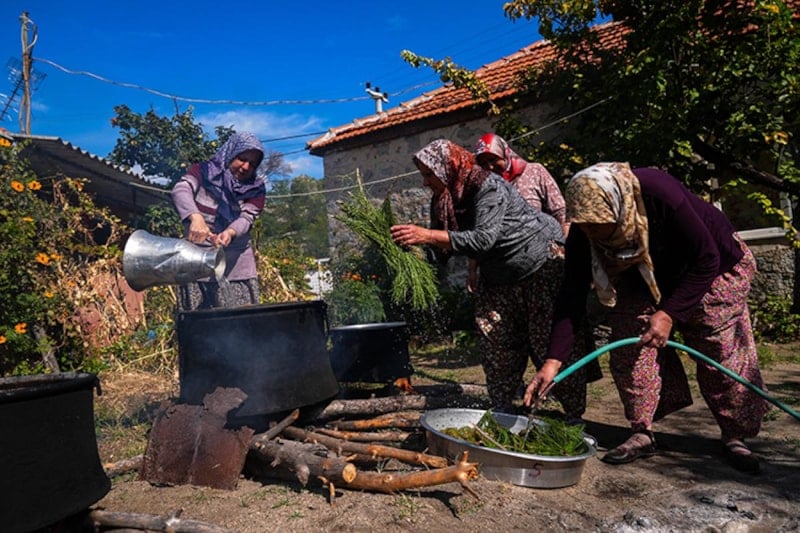 İzmir'in Bergama ilçesindeki kadınlar, Kozak Yaylası'ndaki kızılçam ağaçlarının kozalaklarıyla imece usulü pekmez yapıyor.