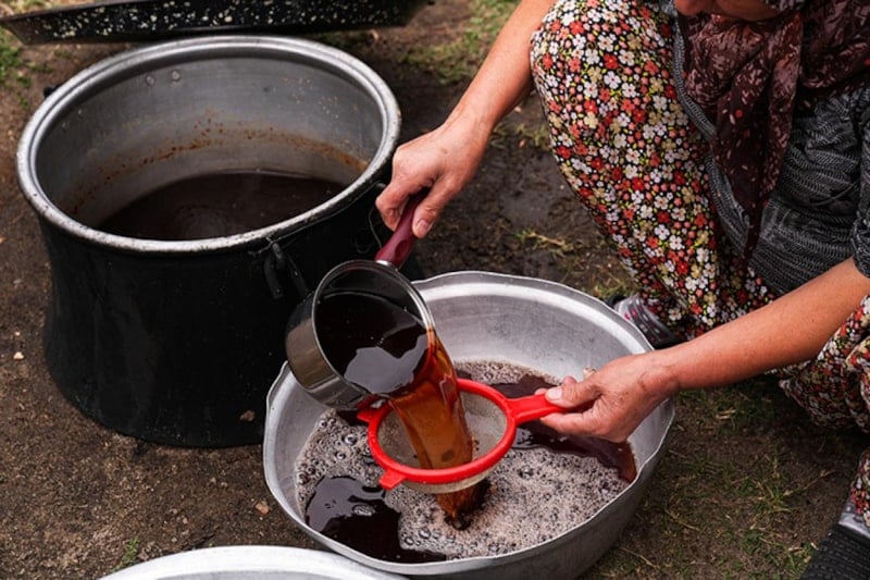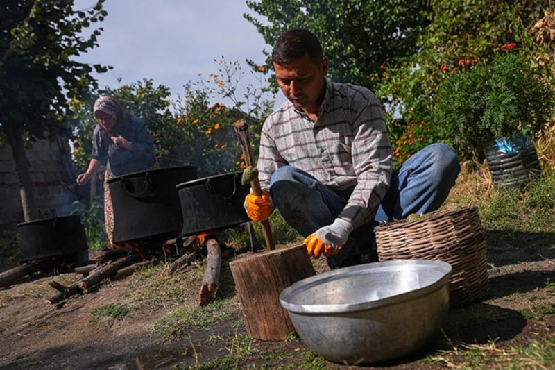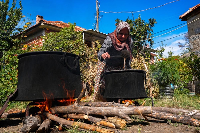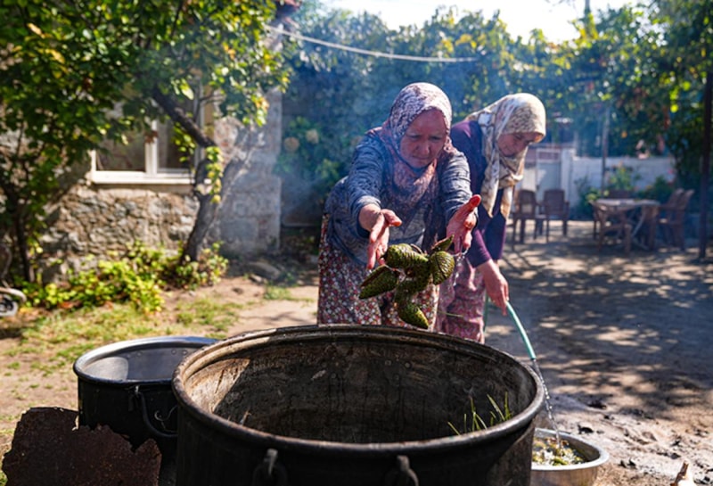 Kaynama sırasında aroması için çam reçinesi ve üzüm pekmezi eklenen karışım, yaklaşık 8 saat boyunca pişiriliyor. Kıvamını alan pekmez süzülüp bir süre dinlendirildikten sonra kavanozlara dolduruluyor. Ürün, Türkiye’nin dört bir yanından gelen siparişlerle kadınların ekonomik gücüne katkı sağlıyor.