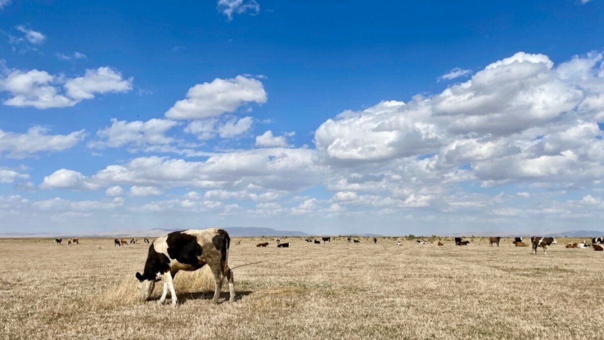 İlçenin Yeniköy Mahallesi'nde yaşayan 61 yaşındaki Mustafa Sakallı, içinde kendi hayvanlarının da olduğu 170 büyükbaşı kuruyan göl yatağında otlatıyor.