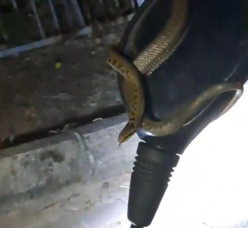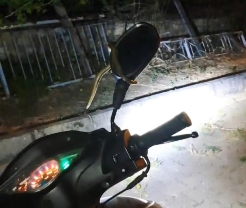 Park halindeki motosikletin direksiyon kısmına giren yılanı fark eden sürücü Erdem Sarıca, aracı kullanmaktan vazgeçti.