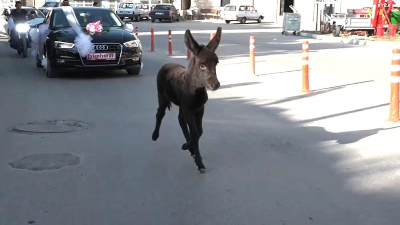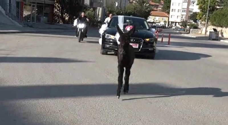 Konvoyun hareket etmesiyle birlikte 4-5 aylık olduğu tahmin edilen bir sıpa, gelin arabasının önüne geçip koşturmaya başladı.