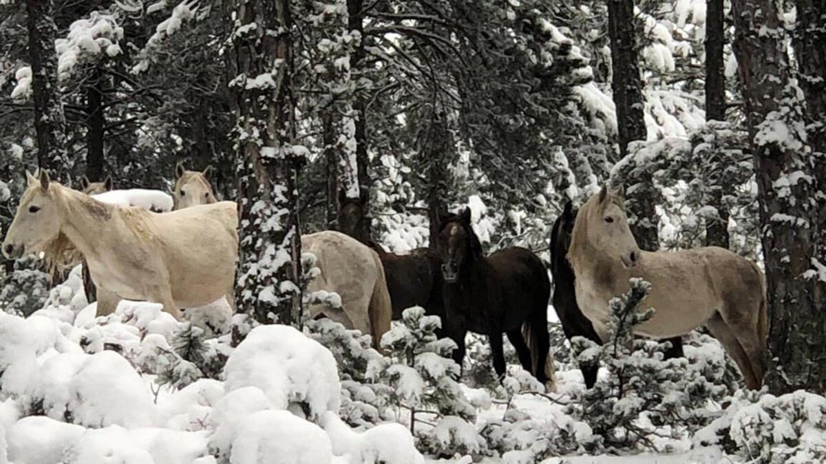 Kulüp üyeleri, kar yağışının ardından beyaza bürünen ormandaki yılkı atlarını cep telefonuyla görüntüledi.