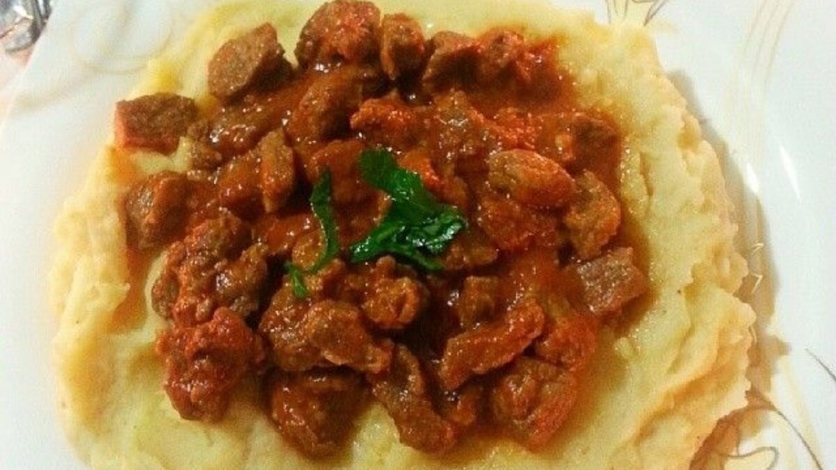 500 gram dana eti sıvı yağ 1 adet soğan 2 adet yeşil biber 2 adet kırmızı biber yarım yemek potu salça Tuz 1 çay potu pul biber 1 çay potu kekik Yarım çay bardağı suPatates püresi için;