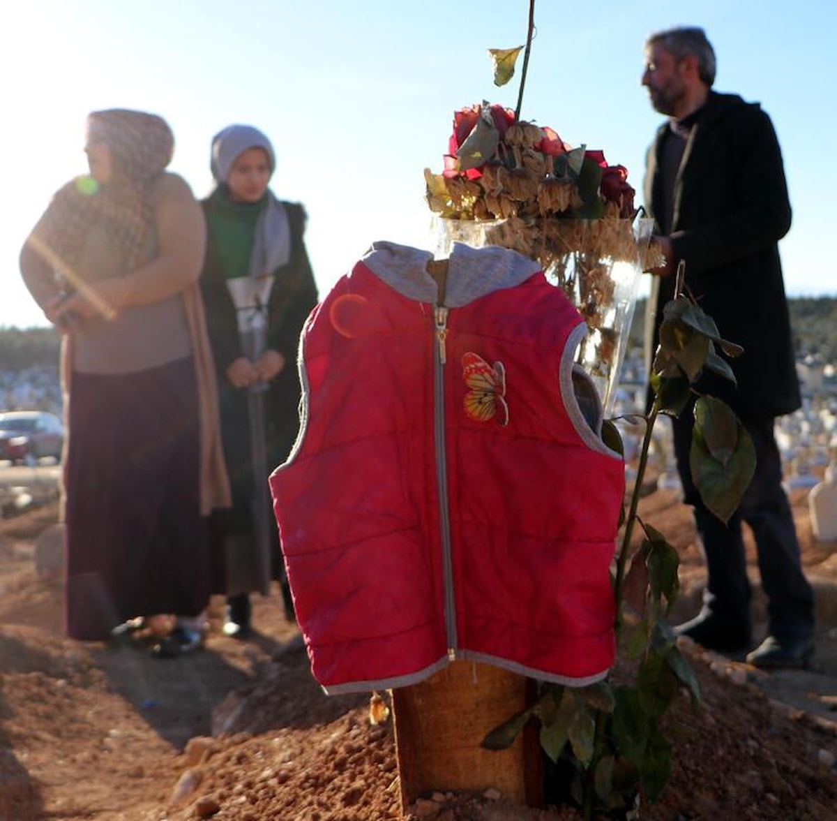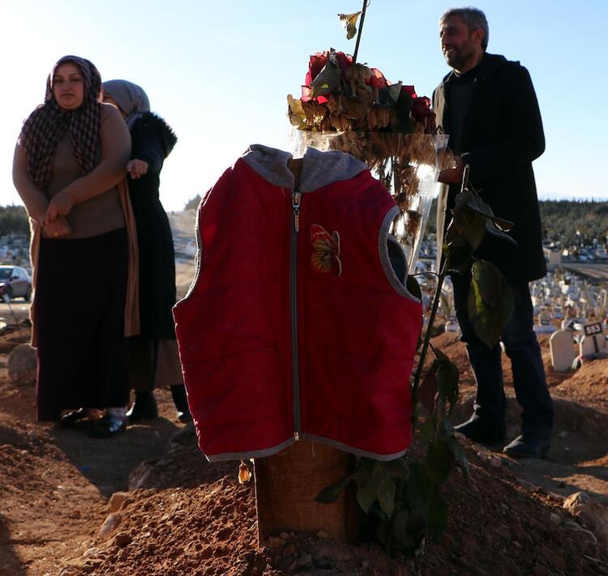 Mezar başlarına yakınları tarafından eşarp, seccade ve bere gibi özel eşyalar asıldı. Bir mezarın başında tahtaya asılan kırmızı çocuk montu ise dikkat çekti.