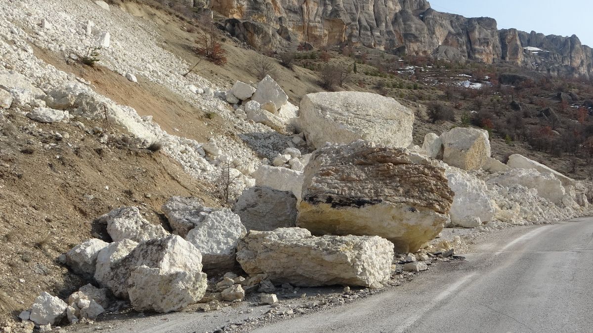 Akçadağ ilçesi Levent Mahallesi’nde kopan dev kaya parçaları yollara savruldu.