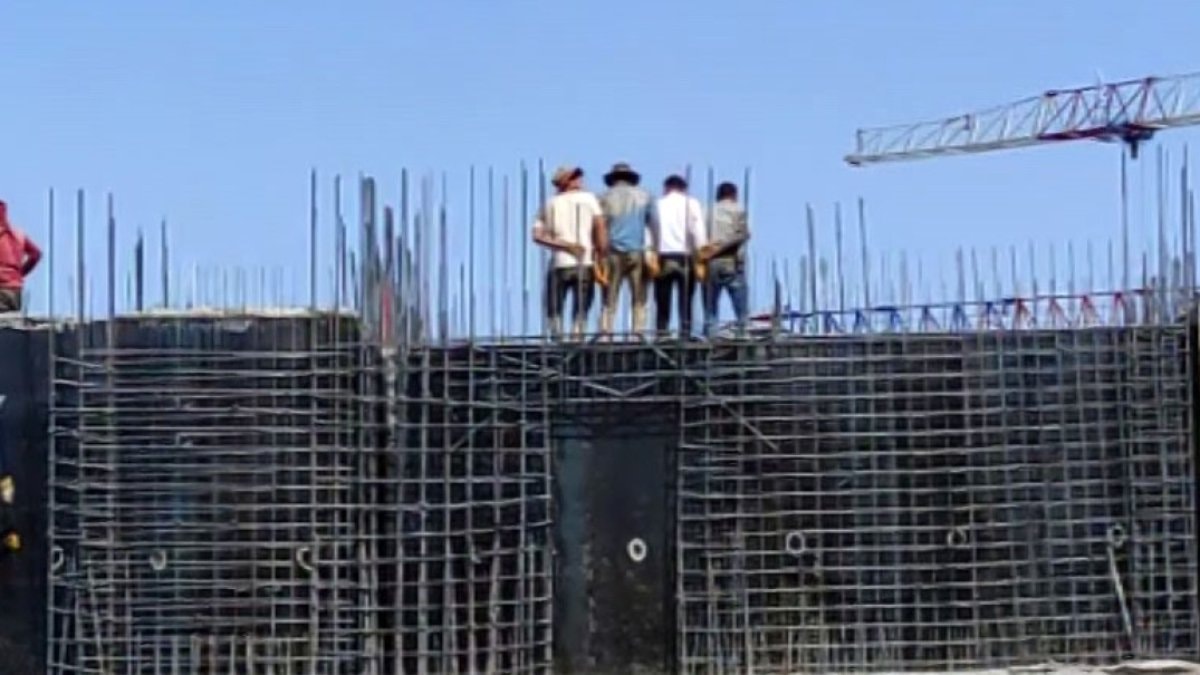 Görüntülerde çalışmaları görüntülemek isteyen ER TV'de Programlar Müdürü Burak Altun, cep telefonu ile hikaye çekerken inşaatta 4 işçinin halay çekmesine şahit oldu.