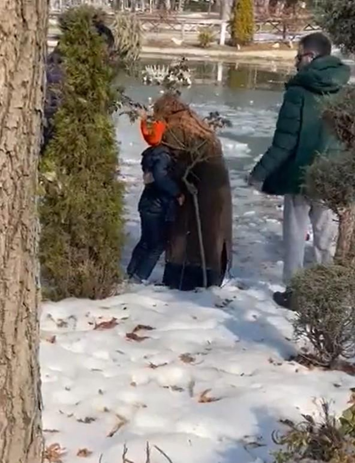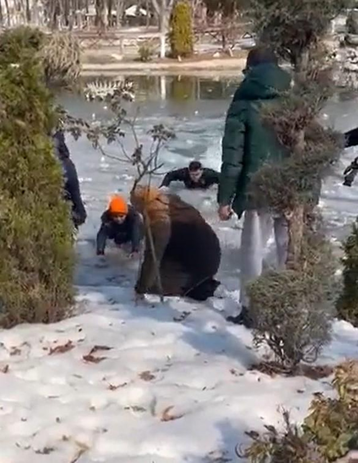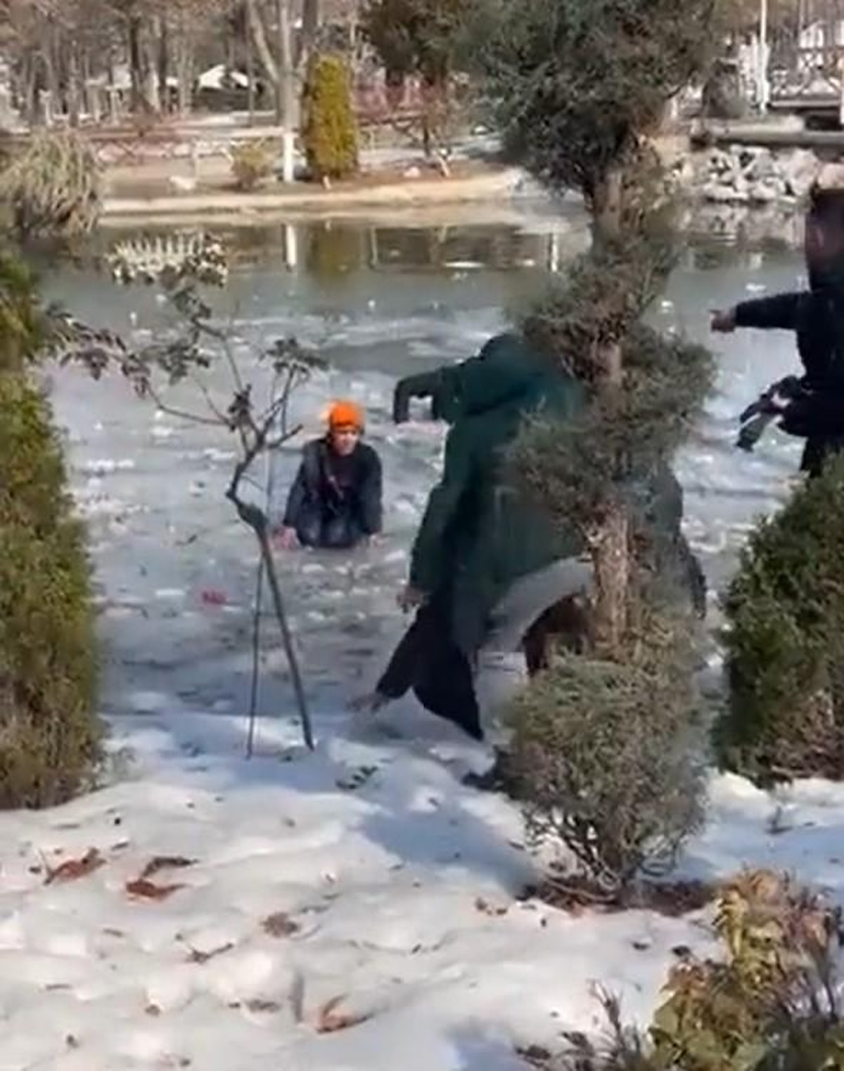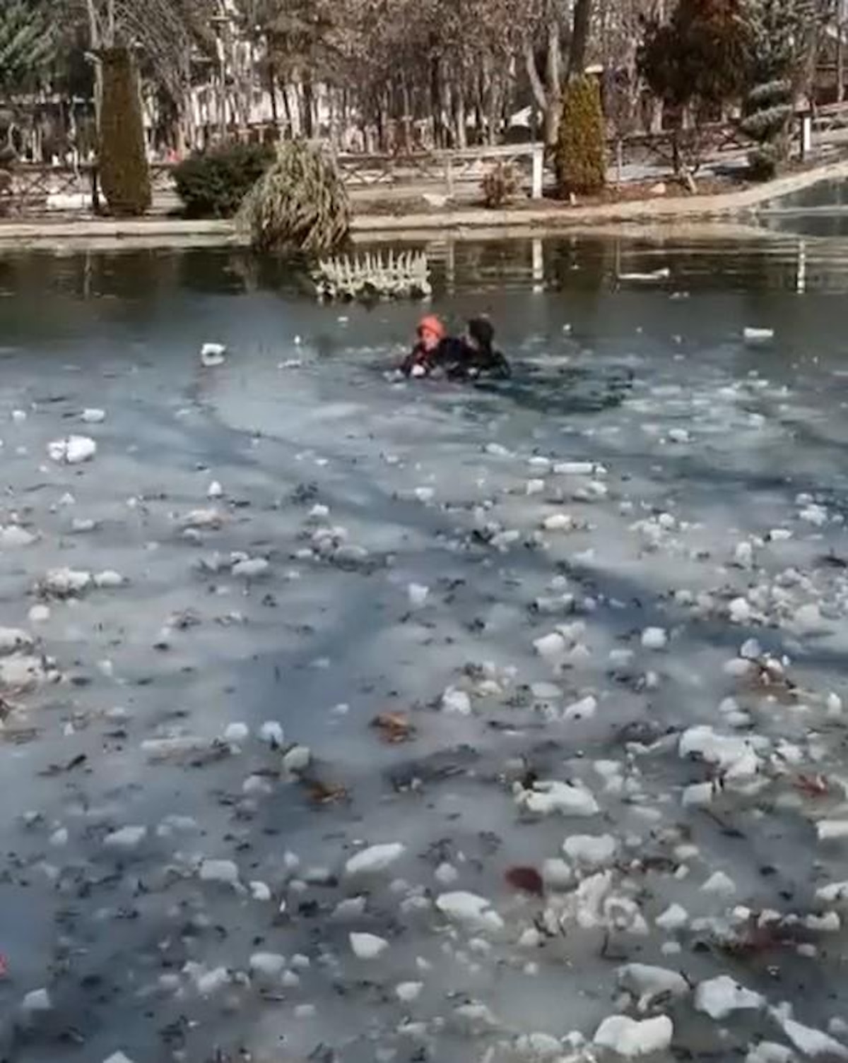 Soğuk hava nedeniyle buz tutan gölde mahsur kalan çocuğun imdadına dalgıç polisi yetişti.