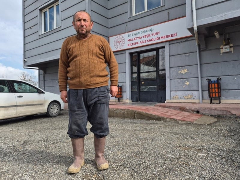Doğan, çamurlu olduğu için çizmelerini çıkarıp, ayağına galoş giyerek sağlık merkezine girdi.
