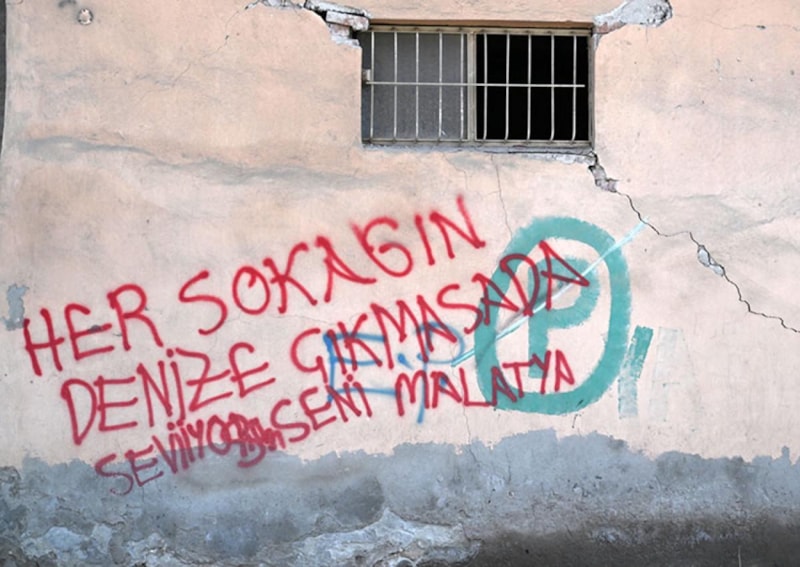 "Seveceksen beni deprem gibi sev, hiç yakamı bırakma" gibi esprili ifadeler taşıyan yazıların bulunduğu duvarlarda, "Umudumuz var", "Her sokağın denize çıkmasa da seviyorum seni Malatya" şeklinde umut dolu mesajlar yer alıyor.