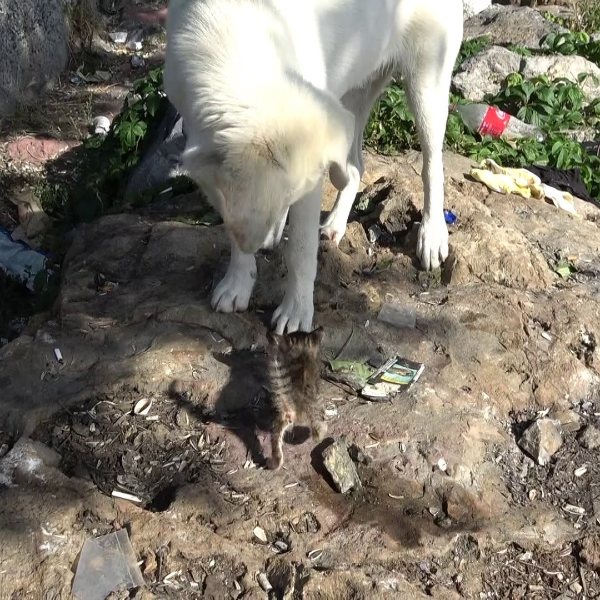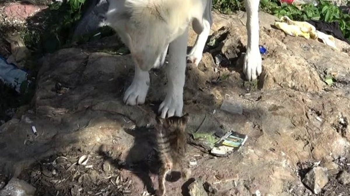 Sokak köpeği, kayalıklarda bulunan ve annesi tarafından terk edildiği düşünülen yavru kediye arkadaşlık etti.