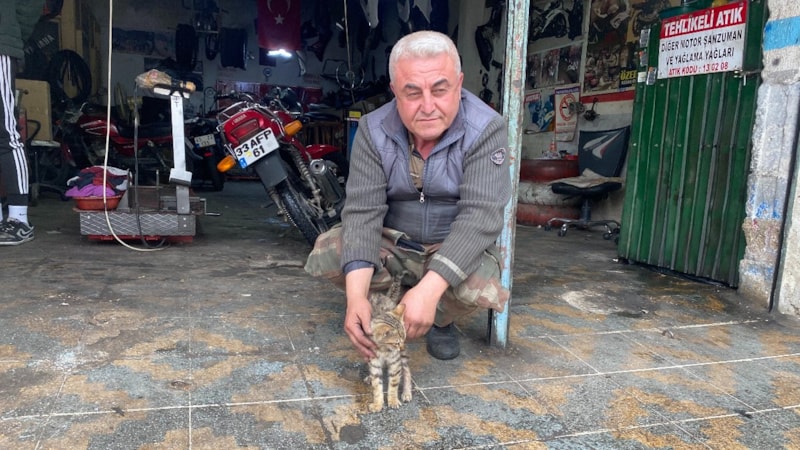 Manisa’nın Alaşehir ilçesinde motosiklet tamirciliği yapan İbrahim Aydın, iş yerine giren yaralı kediyi görünce vakit kaybetmeden veterinere götürdü.