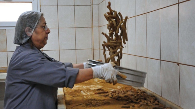 Manisa'yı Mesir'i Tanıtma ve Turizm Derneği imalathanesinde, 15 kadın tarafından yaklaşık 5 asırlık geleneğe uygun şekilde hazırlanan mesir macunları, tek tek işlendikten sonra özel kağıdına sarılıyor.